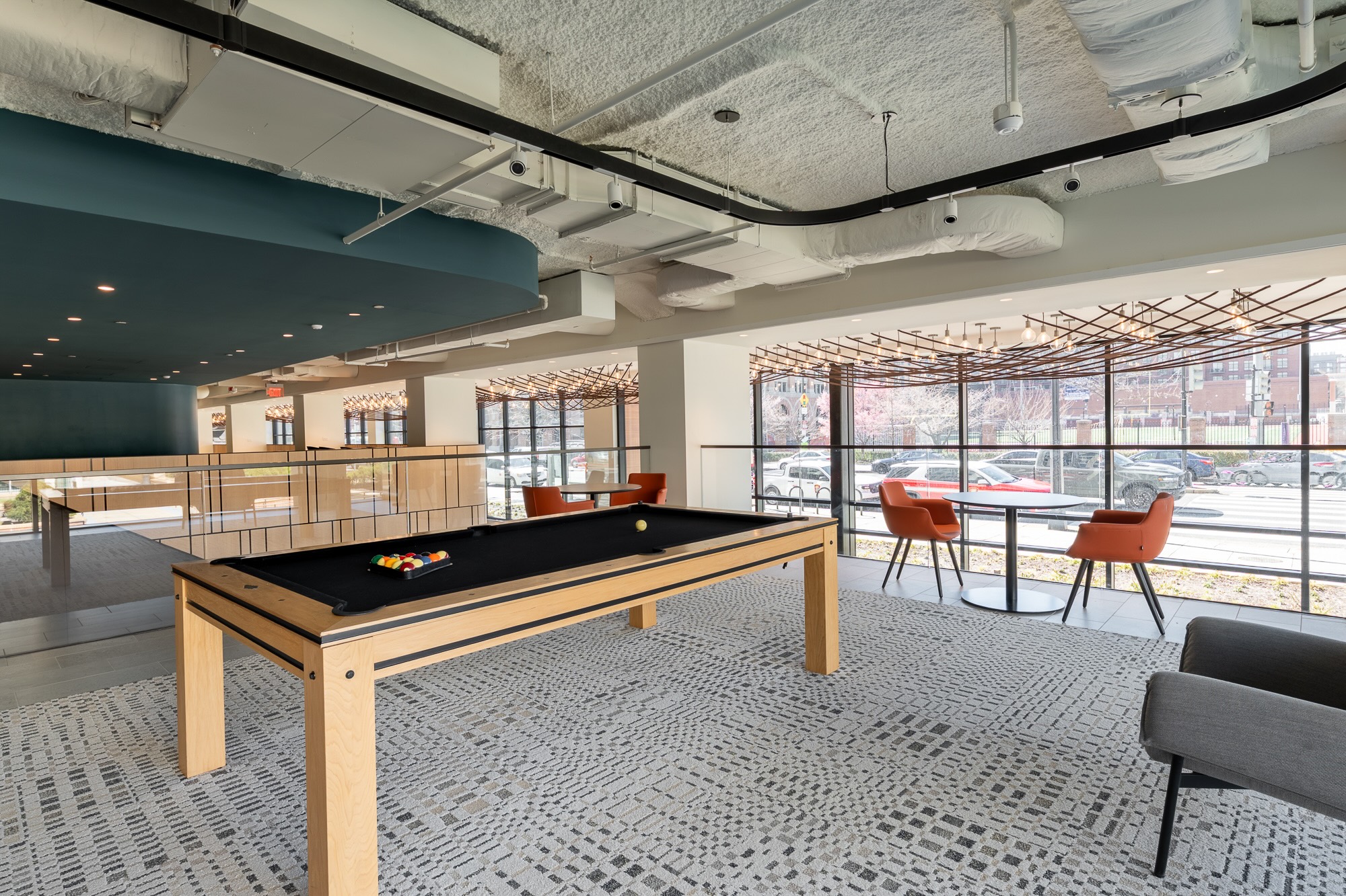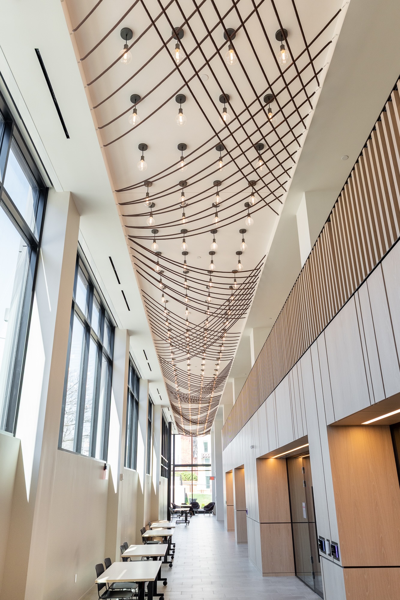 In a building with multiple government agencies, this installation creates high impact in a high traffic area. Grace Teng's art installation spans over 130 feet across the ceiling and is inspired by the urban skyline at night. Paired with a canopy of string lights, this large-scale installation creates a sleek and dramatic moment.