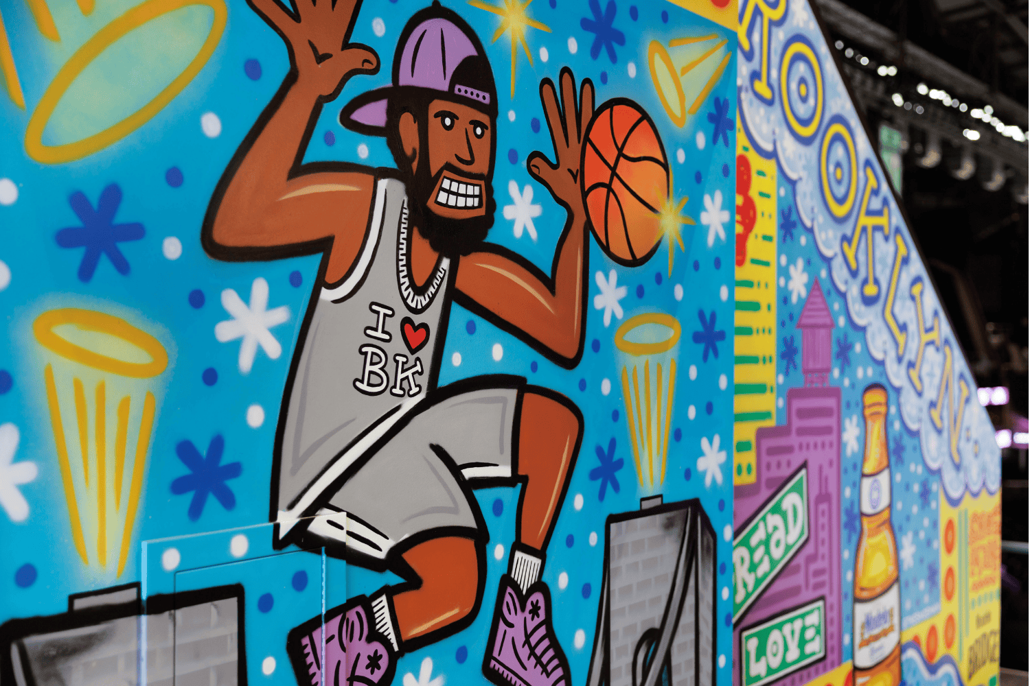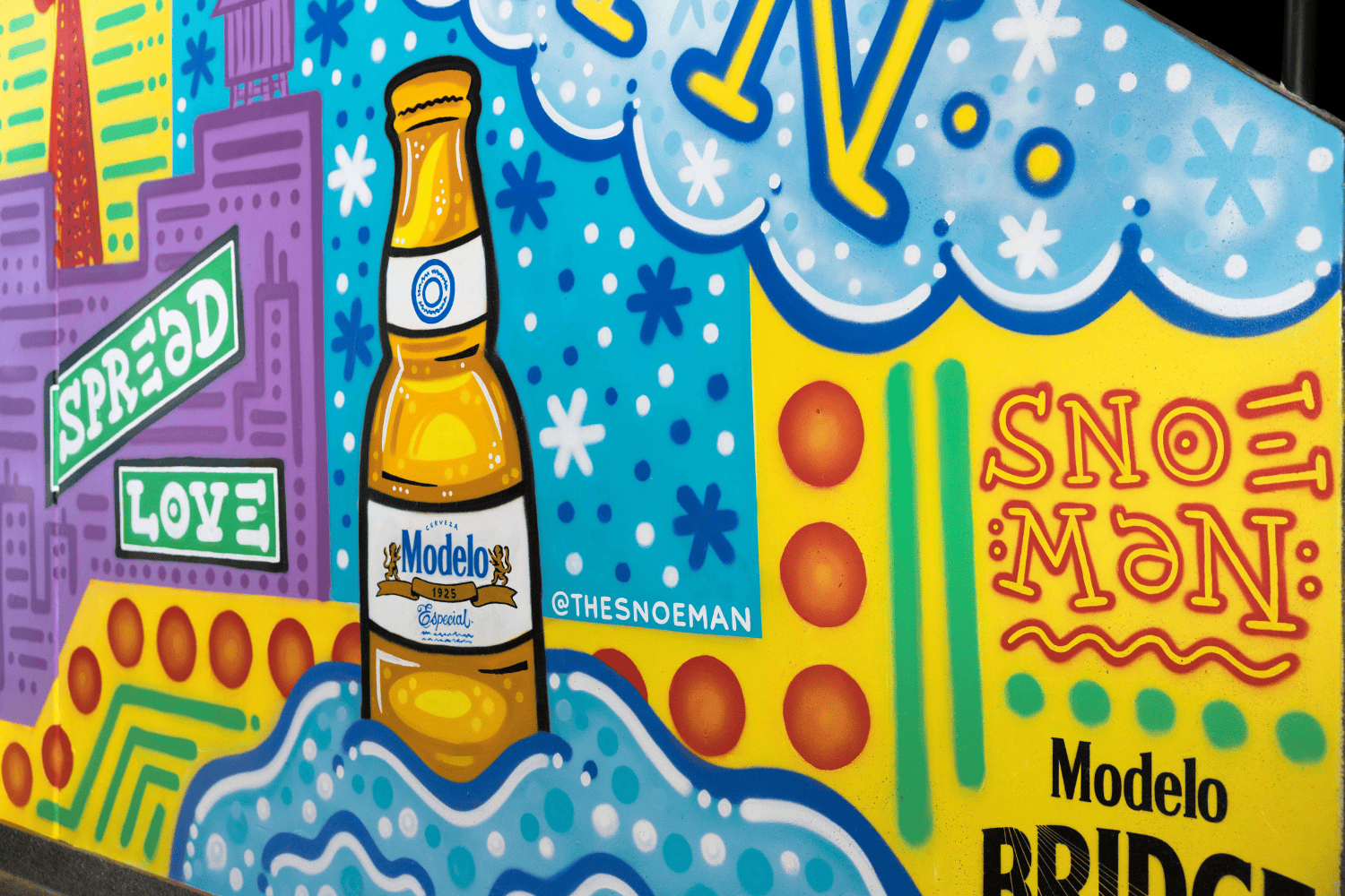 At Barclays Center’s The Bridge, four artists brought to life four murals with unique interpretations of the Brooklyn Bridge, the Brooklyn Nets, and sponsor Modelo. Each artist translated these influences through their own visual language, creating murals that pulse with the energy of a sports arena.